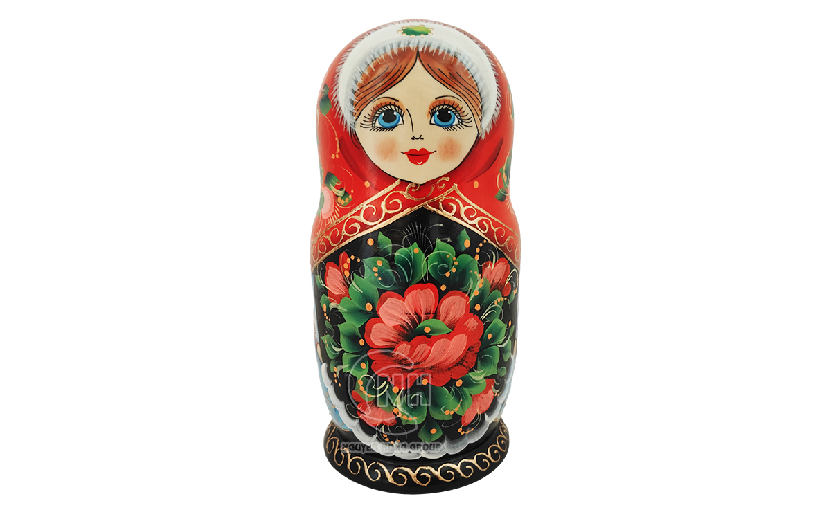 Búp bê Matryoshka đóa hồng đỏ thắm gây ấn tượng bởi hình ảnh hoa hồng lớn rực rỡ ở giữa thân búp bê, kết hợp cùng họa tiết xanh lá tinh tế và nền đen tương phản. Khuôn mặt búp bê được tô điểm bằng những nét vẽ mềm mại, tạo cảm giác ấm áp và duyên dáng.