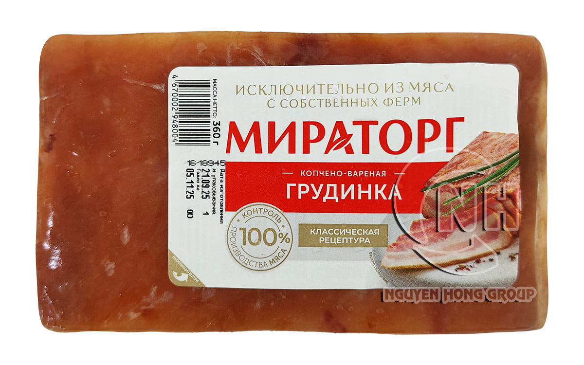 Thịt ba chỉ lợn hun khói Miratorg do Miratorg – một trong những tập đoàn thực phẩm lớn và uy tín tại Liên bang Nga – sản xuất. Sản phẩm làm từ thịt ba chỉ chọn lọc, hun khói tạo nên mùi thơm đặc trưng. Thịt ba chỉ lợn hun khói Miratorg phù hợp với bữa cơm gia đình, các buổi dã ngoại và tiệc nhẹ. Sản phẩm do Công ty TNHH Nguyễn Hồng nhập khẩu chính ngạch và phân phối tại thị trường Việt Nam.