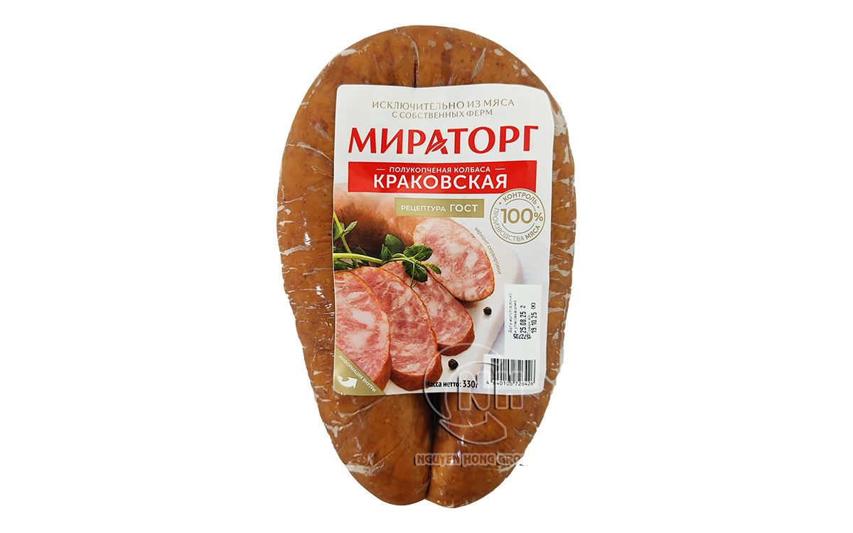 Xúc xích hun khói Krakovskaya do Miratorg – một trong những tập đoàn thực phẩm lớn và uy tín tại Liên bang Nga – sản xuất. Sản phẩm nổi bật với lớp vỏ nâu vàng bắt mắt, thịt mềm, cùng vị đậm đà, béo ngậy và thoảng hương khói. Xúc xích hun khói Krakovskaya phù hợp với bữa sáng nhanh gọn, bữa cơm gia đình hoặc các buổi dã ngoại. Sản phẩm do Công ty TNHH Nguyễn Hồng nhập khẩu chính ngạch và phân phối tại thị trường Việt Nam.